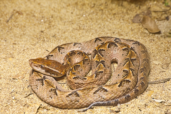 4. งูแมวเซา (Russell’s viper/Vipera russelli siamensis) หัวมีลักษณะเป็นรูปสามเหลี่ยม ตัวอ้วน คอเล็ก หางกลมยาวเรียว ลำตัวมีสีน้ำตาลอ่อนปนเทา มีลายเป็นวงกลมหรือรูปไข่สีน้ำตาลเข้ม มีนิสัยดุ แต่เชื่องช้า เวลาตกใจหรือระวังตัวจะขดตัวเข้ามา แล้วสูดหายใจเข้าออกแรง ๆ ทำให้มีเสียงเกิดขึ้น คล้ายเสียงแมวกรน (หรือแมวเซา) แต่ถ้าศัตรูเข้าใกล้จะฉกกัดได้ เขี้ยวยาวโง้ง และสามารถเคลื่อนไหวได้ เวลากัดจึงขยับเขี้ยวให้ฝังได้ถนัดและลึก ออกหากินเวลากลางคืน ชอบอาศัยอยู่ตามที่ดอน ในซอกหิน โพรงดิน พงหญ้า ชอบที่แห้ง ๆ มากกว่าที่แฉะ ๆ มีชุกชุมในภาคกลาง เช่น กรุงเทพฯ พระนครศรีอยุธยา อ่างทอง ลพบุรี สิงห์บุรี สระบุรี นครสวรรค์ เป็นต้น มีพิษต่อเลือด